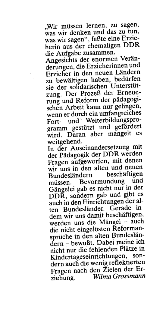 Der folgende Artikel wurde von Wilma Aden-Grossmann in der Zeitschrift Erziehung und Wissenschaft im Dezember 1991 veröffentlicht und löste damals eine hefitige Diskussion in den neuen Bundesländern aus. Er ist hier unverändert zu lesen.